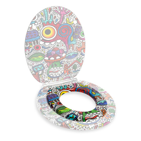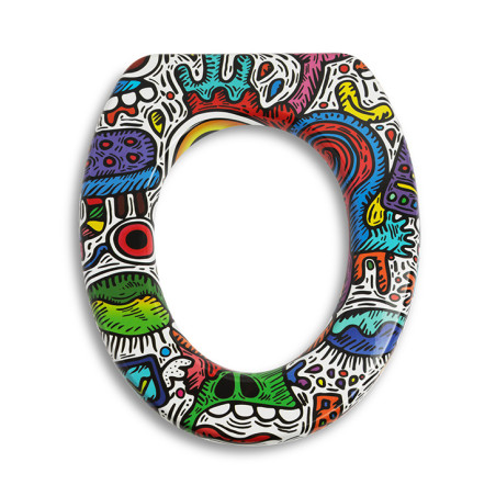 Entdecken Sie den Toilettensitz Crazy Maniac für Kinder - designt von dem talentierten Künstler Skwak, dessen Werke weltweit ausgestellt werden. Ein unentbehrliches Accessoire, um Ihre Kinder bei diesem wichtigen Schritt, dem Gang zur Toilette, zu unterstützen. Ein spielerisch bunter Kindersitz – entworfen als Kunstobjekt für Eltern und als lustige Erfahrung für Kinder, die von diesem Design bestimmt begeistert sofort sein werden.
