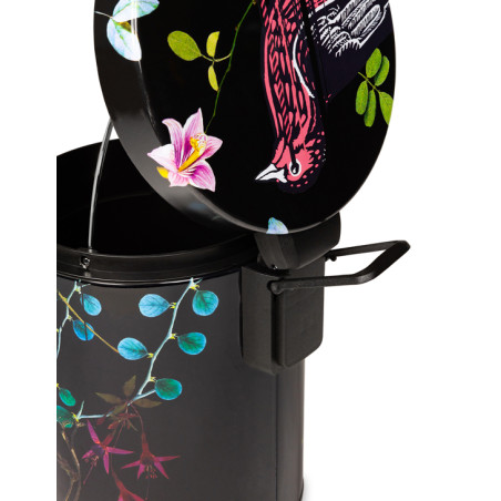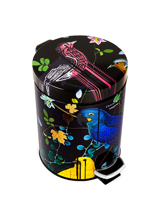 La Maison Christian Lacroix s’associe à la marque TohaaDesign pour vous proposer un modèle de poubelle de salle de bain unique. Ce dessin emblématique de la prestigieuse Maison Lacroix "Birds Sinfonia", au fond noir intense, s’anime d’une nuée d’oiseaux aux plumages chatoyants retraçant les portées musicales de leur propre chant.